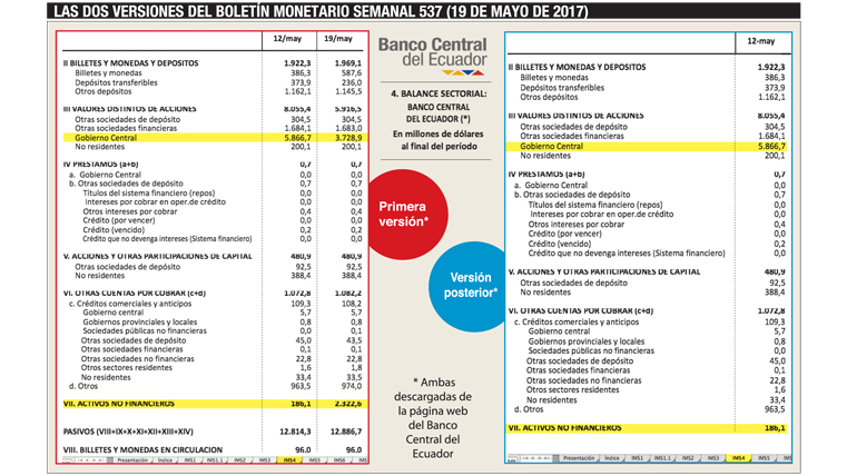 The Central Bank and the Government have downplayed their outstanding account by $ 2,137.8 million. This is reflected in the first version of the Weekly Monetary Bulletin, published on the website of the Central Bank of Ecuador, updated on May 19. The curious thing is that in addition to reducing the amount owed by the Government to the Central Bank, the non-financial assets of the Central Bank have increased by nearly the same amount (2,136.5 million dollars).