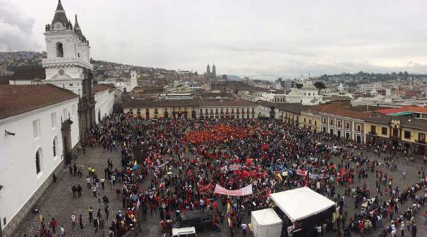 Today, at 10:30 representatives of social, trade union and indigenous groups marched to the Plaza de San Francisco, in Quito. Retirees and teachers have joined this demonstration on the occasion of the Labor Day. Different organizations such as Popular Front, the Confederation of Indigenous Nationalities of Ecuador (CONAIE), the United Workers Front (FUT), the General Union of Workers of Ecuador (UGTE), among others, have gathered to protest against the new Law for Labor Justice, because according Edgar Sarango, president of FUT, “workers’ rights are being violated.”