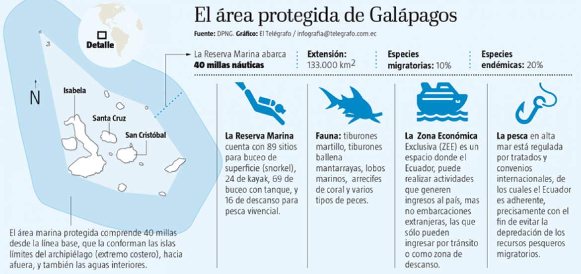 El funcionario detalló que la reserva marina es un espacio de uso pesquero artesanal y turístico. Para el primer caso 1.000 marinos galapagueños, a bordo de 500 embarcaciones, operan en esa zona; mientras que para el segundo, se registra la visita anual de 230.000 turistas.