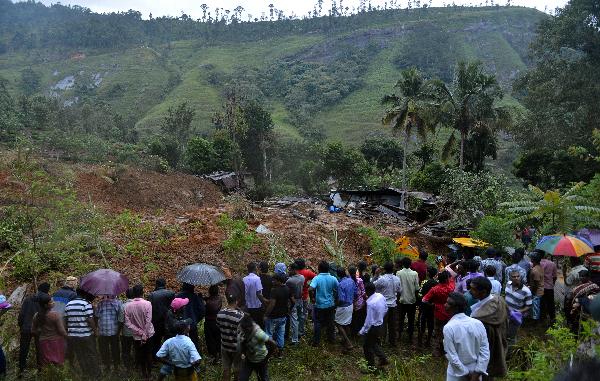 Residentes de Sri Lanka se colocan cerca de un edificio dañado en el lugar de un deslizamiento de tierra provocado por las fuertes lluvias monzónicas en la aldea de Koslanda en el centro de Sri Lanka el 29 de octubre, 2014. Los aludes de lodo provocados por las lluvias monzónicas barrieron a través de una región de cultivo de té de Sri Lanka el 29 de octubre matando al menos a 16 personas y dejando alrededor de 300 desaparecidas.