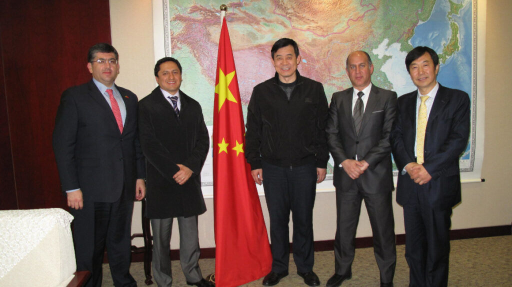 Nilsen Arias; el entonces ministro Rafael Poveda; Bo Qiliang, gerente de Petrochina; Óscar Herrera, de Seguros Sucre, y Xing Zhang, de Andes Petroleum, durante una visita a China el 11 de abril de 2013.