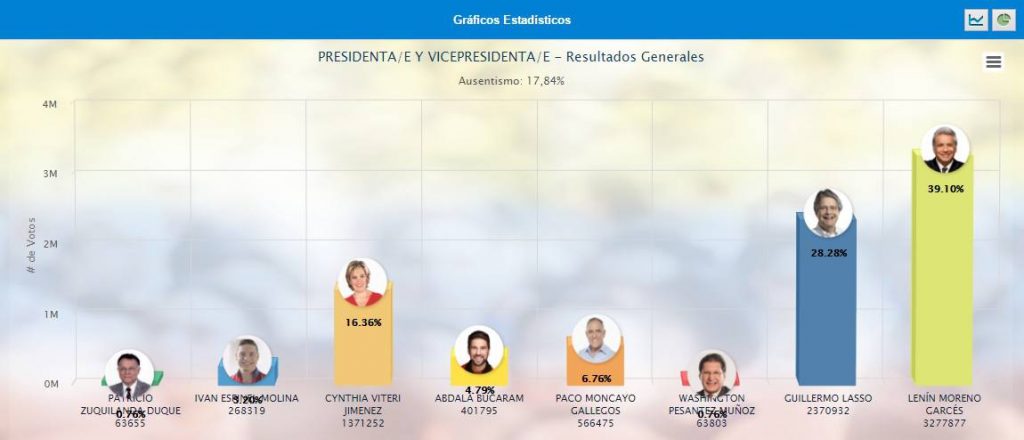 Según los resultados hasta el momento, Moreno va adelante con 3’292.566 votos frente a lo 2’381.3438 votos de Lasso.