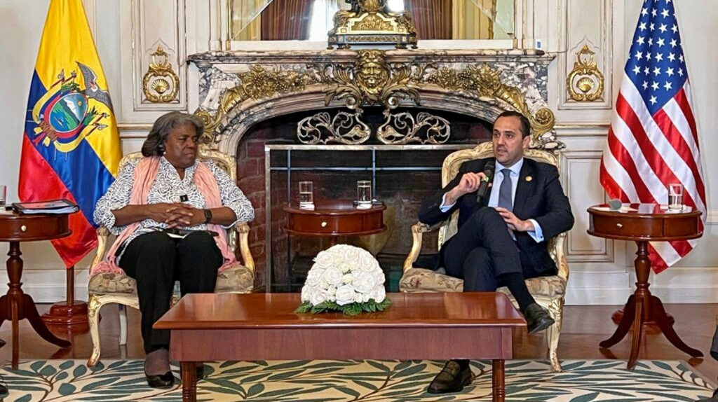 La embajadora de Estados Unidos, Linda Thomas-Greenfield, y el canciller de Ecuador, Juan Carlos Holguín, en Quito.