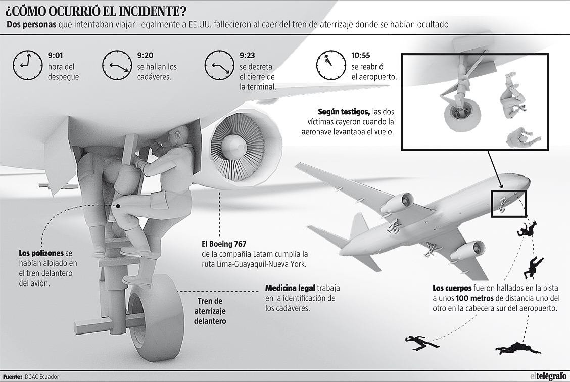 Los fallecidos se habrían ubicado en el tren delantero de la aeronave de Latam, cuyo destino era Nueva York, EE.UU. La terminal de pasajeros paró las actividades por casi dos horas mientras se efectuaron las pericias policiales. Dos personas fueron encontradas ayer muertas en la pista del aeropuerto José Joaquín de Olmedo, de Guayaquil.