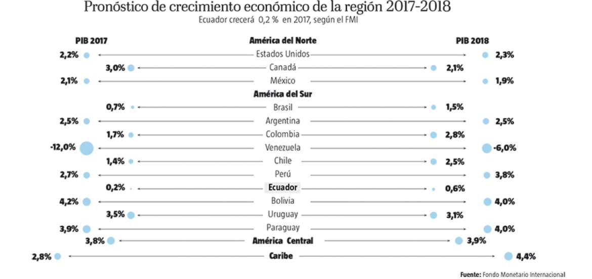 La economía ecuatoriana tendrá un crecimiento de 0,2% en 2017 y para el siguiente año se espera que esta tasa alcance el 0,6%, según las previsiones del Fondo Monetario Internacional (FMI) presentadas  ayer en Washington, dentro del informe Perspectivas Económicas Mundiales, Octubre 2017.