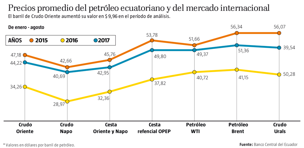La diferencia ocurre por un repunte de los precios de comercialización. Durante el período de análisis el valor promedio del crudo ecuatoriano creció de $ 32,10 (2016) a $ 42,75 (2017) por barril. Analistas consultados atribuyen la situación al acuerdo de la Organización de los Países Exportadores de Petróleo (OPEP) para estabilizar el mercado mundial con una reducción de la producción, medida vigente desde el 1 de enero de 2017 y prolongada hasta marzo de 2018. Ayer, por ejemplo, el petróleo WTI (referencia para el crudo nacional) cerró con un alza de 0,91% ubicándose en $ 51,92, según el portal especializado Oil Price.