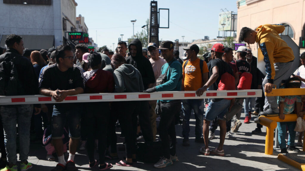 Migrantes latinoamericanos esperan afuera de un paso en México, ante el rumor de que Estados Unidos abrirá la frontera, el 10 de abril de 2023.