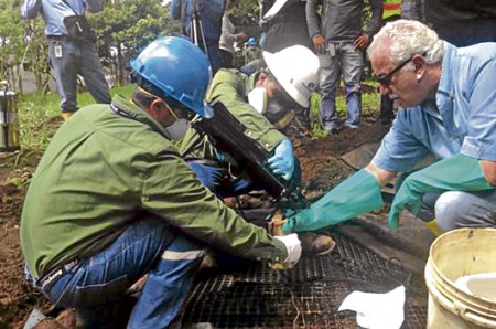 Con la presencia del Fiscal, expertos y técnicos ambientales realizaron una medición de explosividad de gases en uno de los ductos del campo Sacha y se recolectaron muestras de residuos de petróleo, que serán analizadas en los laboratorios de Petroamazonas.