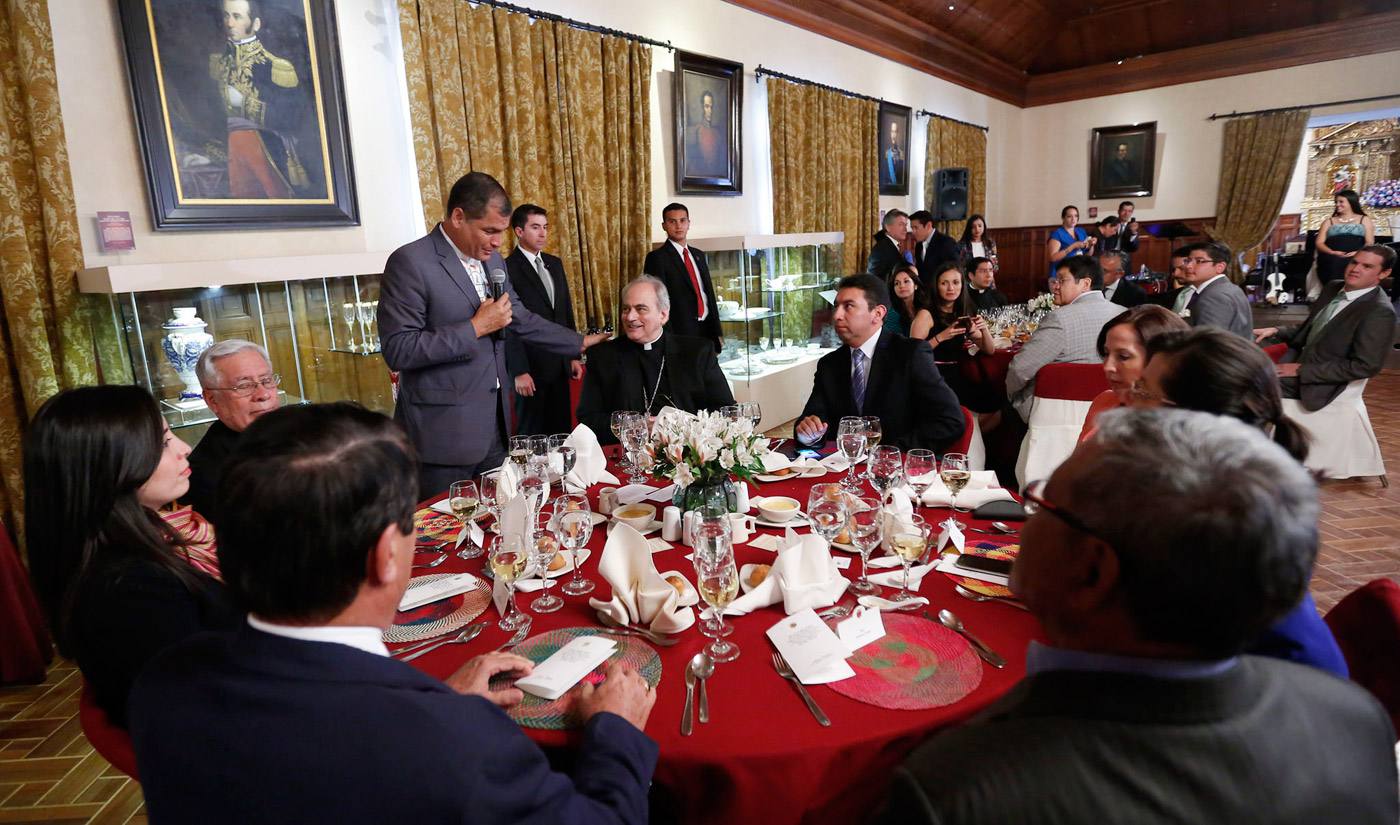 El lunes se realizó un almuerzo en el salón de Banquetes de Casa de Gobierno, organizado por el presidente Rafael Correa, al cual asistieron miembros de la iglesia, ministros de Estado y la cúpula de las Fuerzas Armadas, con el objeto de afinar los últimos detalles de la visita del pontífice a Quito y Guayaquil, el 5 y 8 de julio.