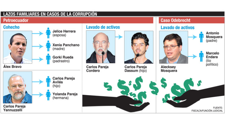 Pero no es el único caso. Los involucrados en supuestos delitos en Petroecuador también confiaron en sus parientes más cercanos. Lo hicieron Ãlex Bravo, exgerente de la petrolera, sentenciado por cohecho, así como el exministro de Hidrocarburos Carlos Pareja.