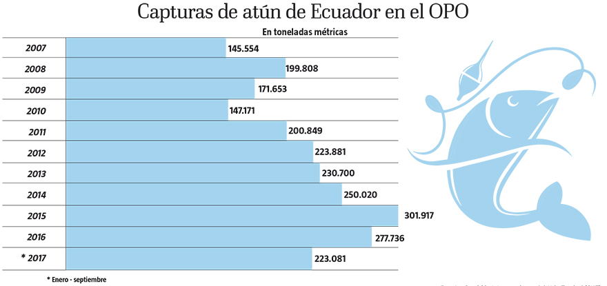 Las capturas de atún de Ecuador en el Océano Pacífico Oriental (OPO) llegaron a 223.081 toneladas métricas ™ entre enero y agosto de este año, lo que representa el 18,3% de crecimiento con respecto a las 188.441 t obtenidas en el similar período de 2016.