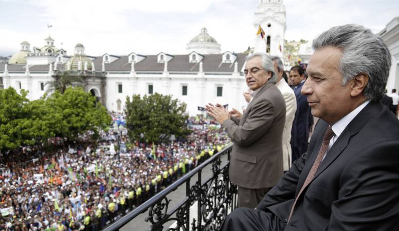 En un breve discurso desde el balcón, Moreno dijo que no va a permitir que se detengan las investigaciones para descubrir los casos de corrupción, al recordar que la semana anterior le quitó las funciones al vicepresidente Jorge Glas por una carta grosera que éste le envió.