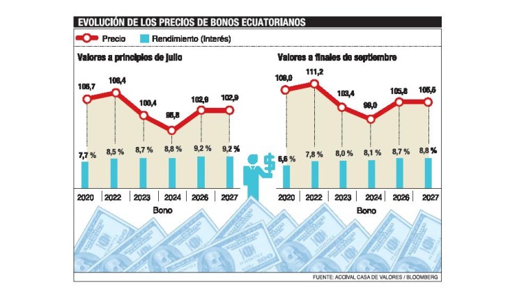 Con ello, el precio de los bonos ecuatorianos ha subido y, por lo tanto, sus intereses han caído 0,5 a 1 punto. Cuando la incertidumbre del país emisor es menor, el papel sube de precio y su interés baja, por lo que endeudarse en esa época suele ser más conveniente.