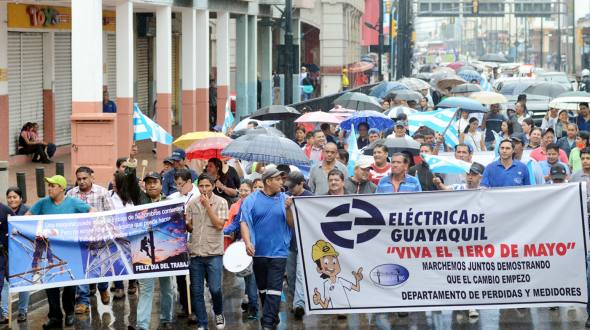 Empleados de la Empresa Eléctrica del Guayas, marcharon en medio de la lluvia para conmemorar el Día del Trabajo.