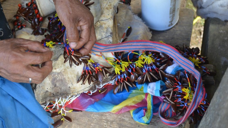 Raquel Kaikiat, nativa shuar, asegura que para abastecerse de las semillas debe cultivarlas. Tiene los dedos lastimados por los múltiples pinchazos a la hora de utilizar la aguja y hacerle el hueco a las pequeñas semillas. Muchas son duras y se las debe cocinar un poco para ablandarlas, indica Kaikiat.