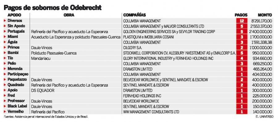 De acuerdo con la información entregada por EE.UU., Odebrecht pagó sobornos por las siguientes obras: Refinería del Pacífico, acueducto La Esperanza, poliducto Pascuales-Cuenca, hidroeléctrica Mandariacu y trasvase Daule-Vinces.