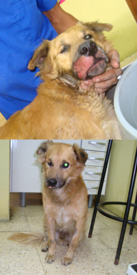 El doctor continúo limpiando y revisando al perrito y luego notó que Bolo no tenía un ojito. Llegamos a la conclusión que el perro había sido brutalmente golpeado, ya que tenía una parte de su cara hinchada, sangraba y además le faltaba un ojo. Expuse el caso en facebook y muchas personas enviaron medicinas y dinero para exámenes a la clínica veterinaria.