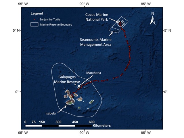 Galápagos fue el destino de Sanjay, un macho adulto de tortuga marina que viajó desde el Parque Marino de Cocos en Costa Rica hacia la Reserva Marina del archipiélago en Ecuador.