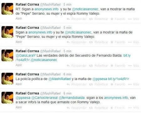 El mensaje que se publicó en la tarde del jueves fue: “Sigan Anonynews.info y su tw (Twitter) @noticasanonec, van a mostrar la mafia de ‘Pepe’ Serrano, su mujer y el espía Rommy Vallejo”, el cual fue borrado poco despúes de restaurar la cuenta.