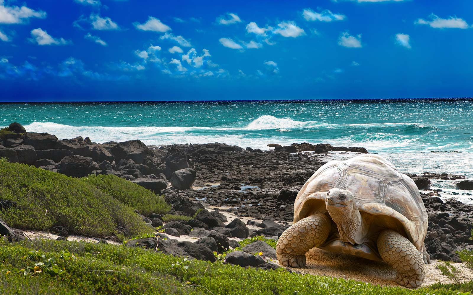 Large turtle at the sea edge on background of a tropical landscape