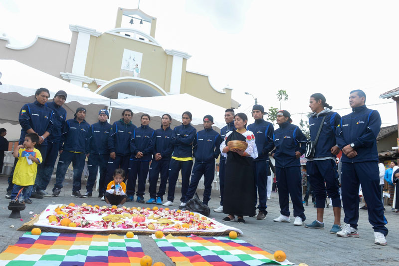 Sus cabezas fueron rociadas con agua (deidad suprema indígena) y con pétalos de rosas rojas y rosadas. Yupaychany. Que vayan y regresen con bien, repetía la mujer que realizaba el ritual, mientras los otavaleños aplaudían y brindaban con chicha.